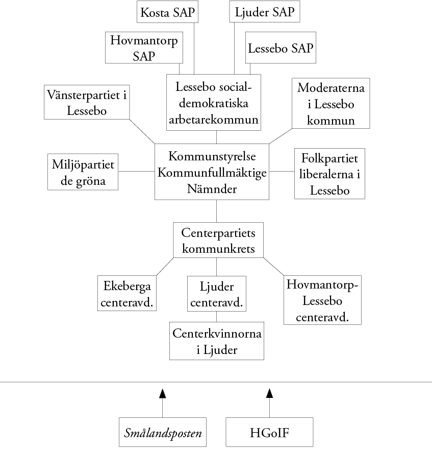 En fråga återstår dock att besvara i det här kapitlet. Vad var det som gjorde att kommunen bestämde sig för att investera ekonomiskt i allhallsprojektet trots sin besvärliga ekonomiska situation? Ett sätt att antyda en förklaring är att föra in en maktdimension i analysen och återvända till frågan om vad det var som hände när organisationer kopplades samman i Hovmantorp. Nedan kommer jag att betrakta relationen mellan det lokalpolitiska fältet och det organisatoriska fältet i Hovmantorp som en figuration bestående av två olika organisatoriska fält och analysera hur interdependensen och maktrelationerna inom denna figuration ändrar karaktär över tid (Elias 1978). Hur ser det lokalpolitiska fältet i Lessebo ut? Lessebo kommun består, som tidigare nämnts,