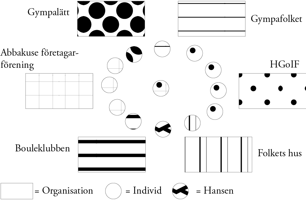 Jag har använt samma kategorier som utgångspunkt men för ett annat syfte. Jag strukturerar min framställning utifrån om individers interaktion sker inom organisationer, mellan organisationer, i semiorganiserade fält eller utanför organisationer för att i stället visa vad individers interaktion får för konsekvenser för relationen mellan organisationer. Jag kommer att visa hur människor, när deras interaktion tar olika vägar i förhållande till den organisatoriska omgivningen, förändrar det organisatoriska fältets sammansättning i Hovmantorp på ett sådant sätt att dess mobiliserande potential ökar.