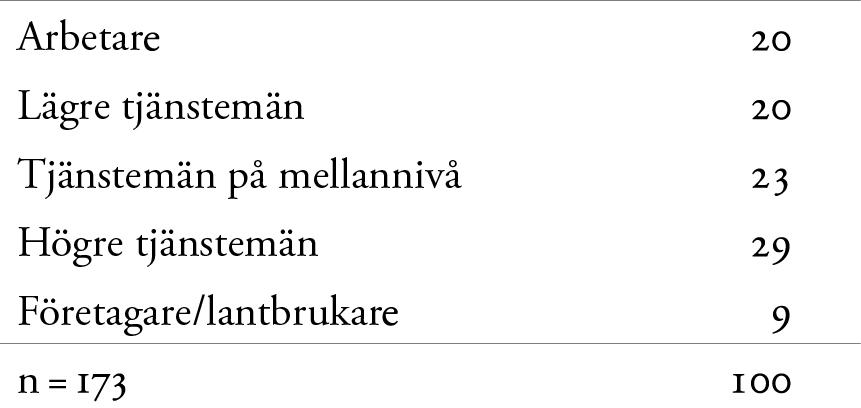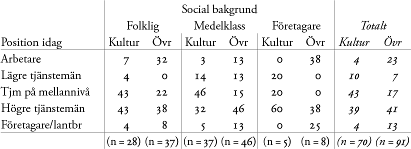 [9]. I den fortsatta framställningen utgår vi från följande sociala kategorier: folklig bakgrund (arbetare och lägre tjänstemän), etablerad medelklass (tjänstemän på mellannivå och högre tjänstemän) samt företagare/lantbrukare.