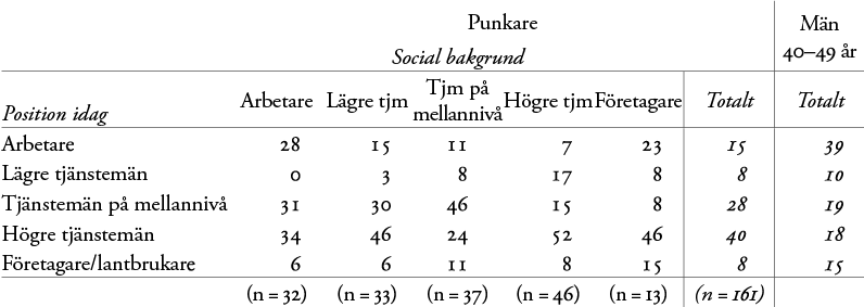 Statistiken visar att punkarna, oavsett bakgrund, har högre sociala positioner än genomsnittet för motsvarande åldersgrupp i hela landet. Det mest anmärkningsvärda resultatet är att mer än 40 procent av punkarna (totalt) idag är högre tjänstemän, jämfört med knappt 20 procent av rikets män i samma åldersgrupp som helhet.