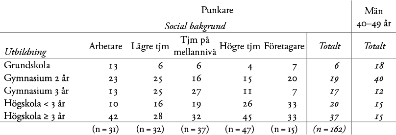 Vi har vidare en population med osedvanligt hög utbildningsnivå. Personer med högstatusbakgrund tenderar att utbilda sig i högre grad än genomsnittet. Det finns emellertid en komplikation som gör siffrorna både intressantare och mer svårtolkade. Oavsett social bakgrund är utbildningsnivån inom populationen hög. I de grupper av punkare vars föräldrar är arbetare, lägre tjänstemän, tjänstemän på mellannivå eller företagare är minst 44 procent högskoleutbildade. Hela 70 procent av punkarna med föräldrar som är högre tjänstemän är högskoleutbildade, men det är mindre förvånande än att 52 procent av dem med föräldrar från arbetarklassen är högskoleutbildade. Om vi betänker att samma åldersgrupp i riket sammantaget ligger på 30 procent är siffrorna uppseendeväckande. Punkarna är en osedvanligt välutbildad grupp oavsett social bakgrund och detta faktum efterfrågar någon typ av förklaring.[9]