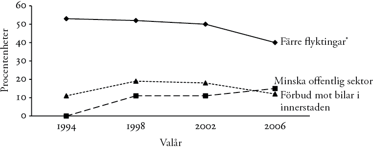 Som ett mått på lyhördheten i förhållande till medborgarnas attityder visar figur 1 skillnaden i procentenheter mellan riksdagsledamöternas och medborgarnas stöd för ett förslag om att ”ta emot färre flyktingar i landet” vid riksdagsvalen 1994–2006. Höga tal indikerar en stor skillnad mellan politikerna och den allmänna opinionen vid ett enskilt tillfälle, och utvecklingen över tid avspeglar lyhördheten. Som referenspunkt inkluderar vi motsvarande information om politiska förslag som gäller miljön (”förbud mot bilar i innerstaden”) och den dominerande höger–vänster-dimensionen (”minska storleken på den offentliga sektorn”).