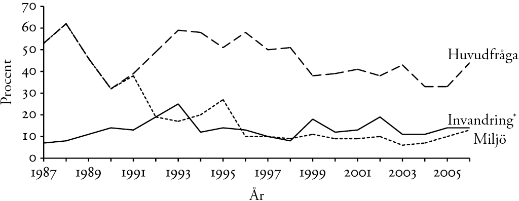 Anmärkning: Andel i procent av respondenter som nämner invandringen och miljön som de viktigaste frågorna för Sverige i dag. Miljön och huvudfrågan finns med för jämförelsens skull. Från 1987 till 1990 var miljön den främsta sakfrågan.