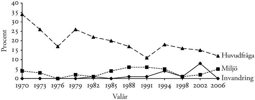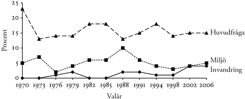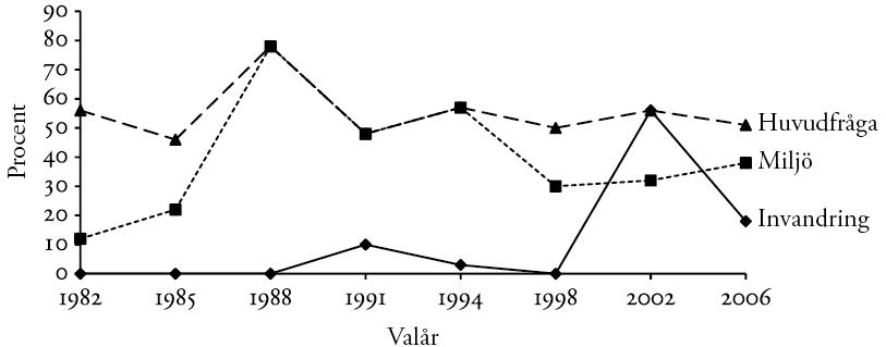 Figur 3 (nedan) visar andelen budskap som ägnas åt invandring i valmanifesten 1970–2006. Åter används miljöfrågan och den sakfråga som vid varje tillfälle får mest uppmärksamhet som referenspunkter. Tabell 3 ) ger detaljerad information om de individuella partierna.