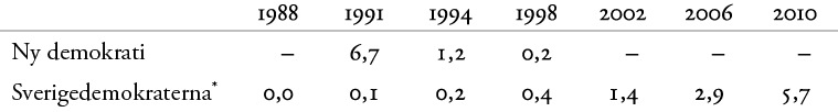 Tabell 1. Ny demokratis och Sverigedemokraternas resultat vid riksdagsvalen 1988–2006 i procent