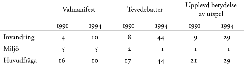 Tabell 3 ovan visade vilken vikt som tillmättes invandringsfrågan enligt våra tre indikatorer (valmanifest, tevedebatter och den upplevda vikten av utspel). Både Moderaterna och Socialdemokraterna fick låga värden på alla tre indikatorerna, vilket visar att alla etablerade partier, oavsett deras politiska positioner, agerade avvisande till och med under 1994 års kampanj.