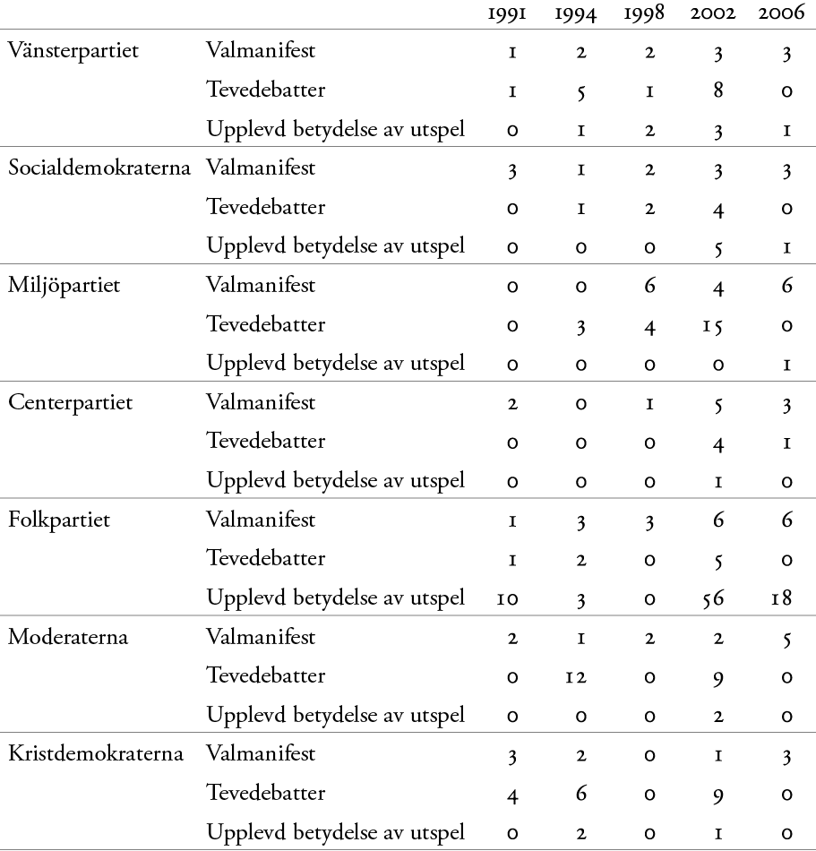 Källa: Esaiasson och Håkansson (2009) för valmanifest och tevedebatter; Holmberg och Oscarsson (2004), Oscarsson och Holmberg (2008) för upplevd betydelse av partiernas utspel.