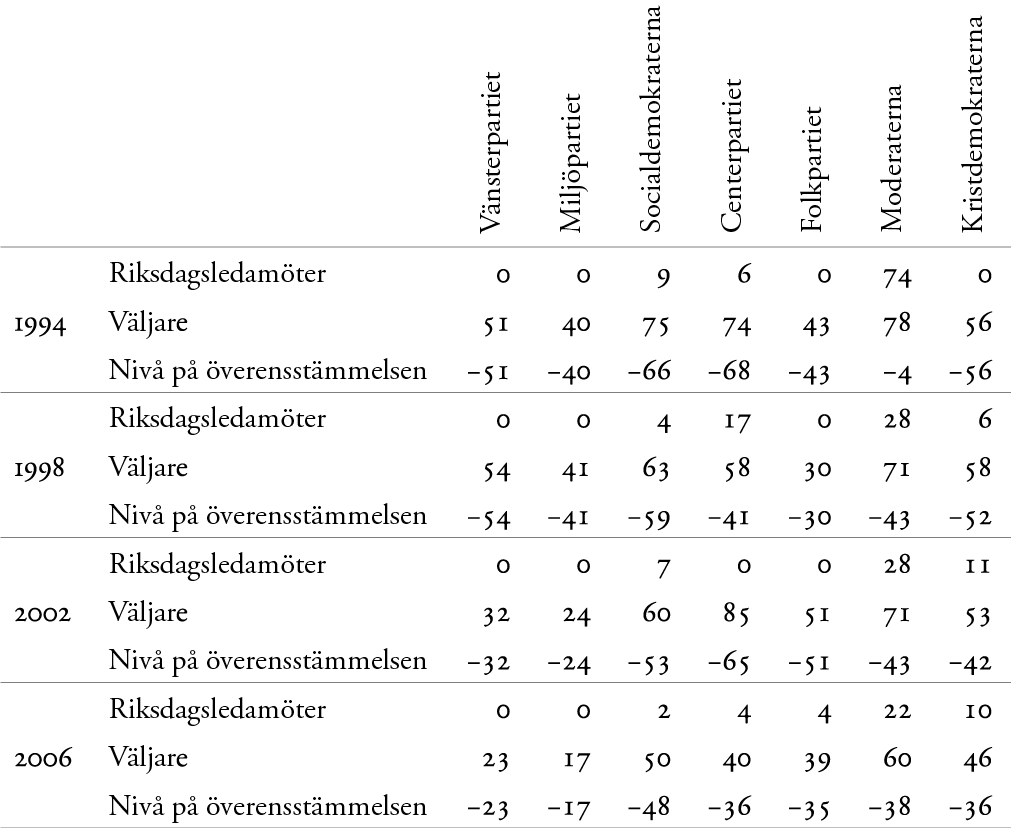 Även om det är tydligt vilken sakfrågestrategi som valdes finns det andra detaljer vid 1994 års val som är viktiga för vår förståelse av de olika etablerade partierna. Bale (2003) hävdar som nämnts att etablerade högerpartier har mest att tjäna på att försöka ta över invandringsfrågan. Om man tar hänsyn till det är det oväntat att Moderaterna deltog i den avvisande strategin. Vid en närmare granskning verkar det som om partiledningens strategiska beslut orsakade interna konflikter. Tabell 4 visar den politiska oenigheten mellan riksdagsledamöterna och partiernas väljare om ett restriktivt invandringspolitiskt förslag mellan 1994 och 2006.