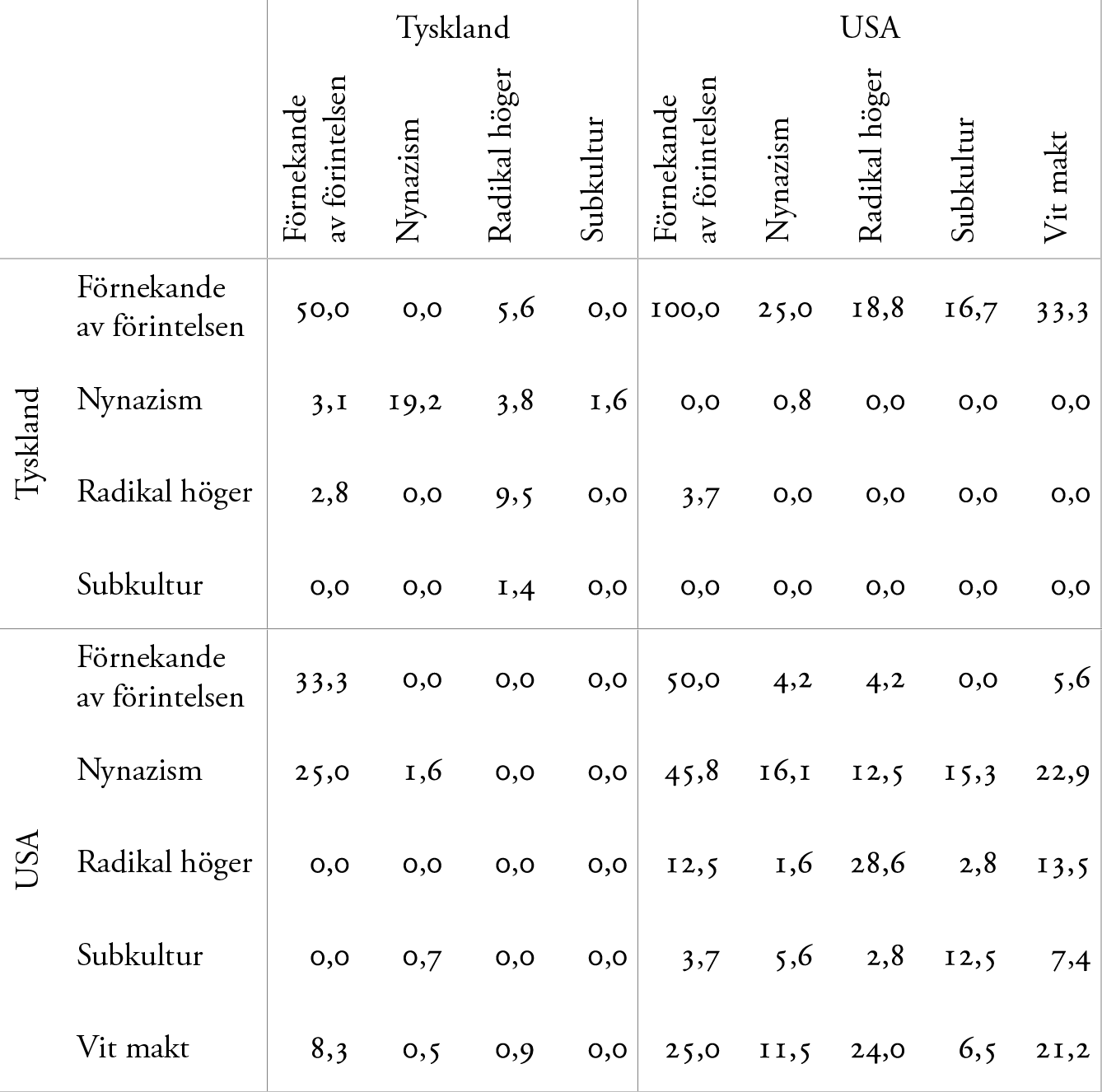 Det visar sig också att de transnationella relationerna mellan tyska och amerikanska sidor nästan bara härrör från dessa båda kluster. Den radikala högern och det subkulturella klustret lägger knappast märke till de amerikanska aktivister som undersöks i den här studien. Å andra sidan visar amerikanska extremister ett ökande intresse för det tyska nynazistiska nätverket och förintelseförnekarnas sidor. Den tyska ”intellektuella högern” verkar fånga vitmaktrörelsens intresse i allt större utsträckning.